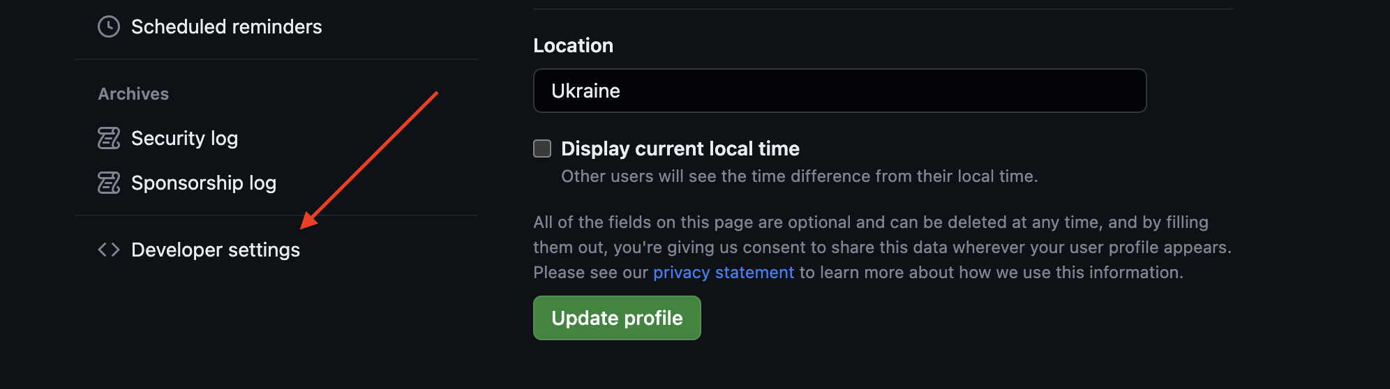 <figure><img src="https://2686245090-files.gitbook.io/~/files/v0/b/gitbook-x-prod.appspot.com/o/spaces%2Faou7mxABOvrk0uZ81vUx%2Fuploads%2FxxayYjMc0yVjLWTwJTfW%2Fimage.png?alt=media&#x26;token=3596bc8b-d2e8-4c6f-9838-a8af2971d140" alt=""><figcaption><p>GitHub Settings</p></figcaption></figure>