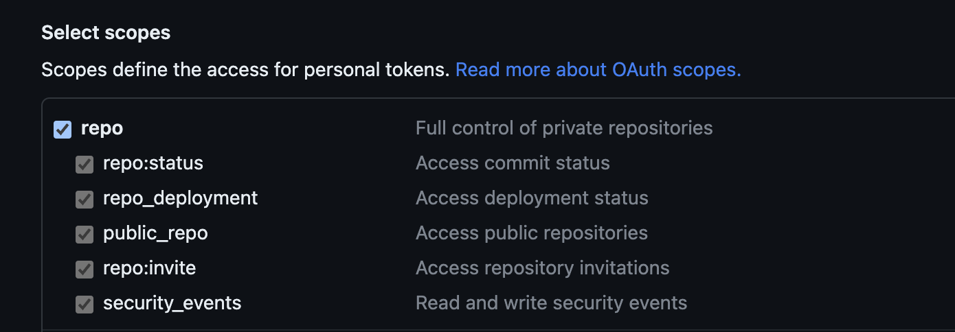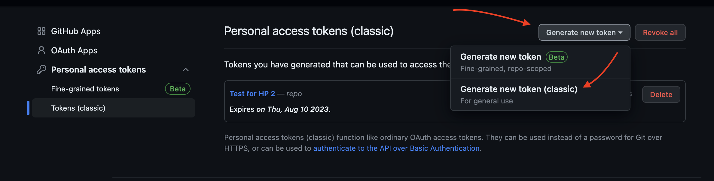 <figure><img src="https://2686245090-files.gitbook.io/~/files/v0/b/gitbook-x-prod.appspot.com/o/spaces%2Faou7mxABOvrk0uZ81vUx%2Fuploads%2Fml8caryJJgAOAEjNlIlz%2Fimage.png?alt=media&#x26;token=a19796e9-2df7-41b1-9308-1ed91c3c5d48" alt=""><figcaption><p>Generate personal access token</p></figcaption></figure>