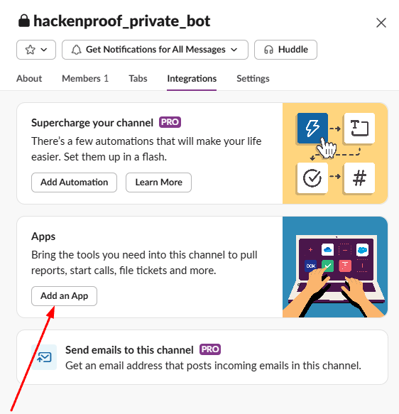 * In the **'Manage apps'** section, you'll see a list of available apps and integrations. Find the **'HackenProof Notifications**' app and click on it.