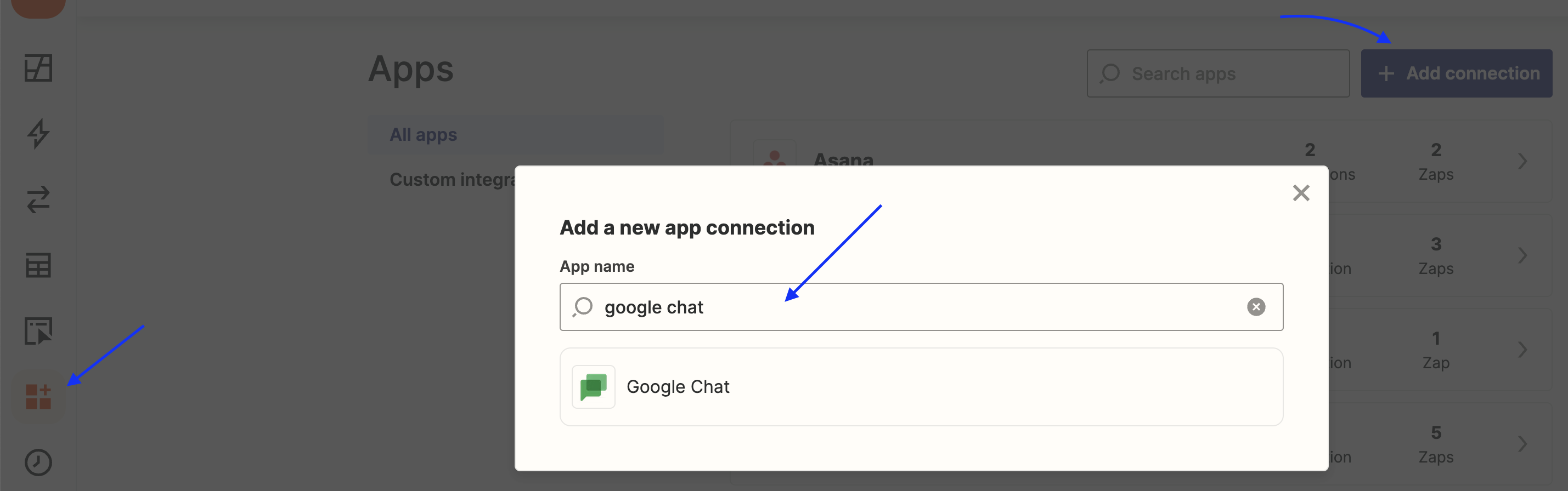 * Connect your Google Chat account in the Zapier App: Navigate to your Zapier Account and make sure you have the necessary connected app